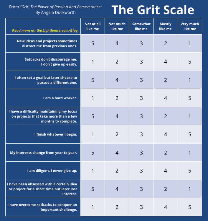 How gritty are you? To answer this question, you may take a Grit Scale test here, developed by Duckworth. Don’t overthink the questions. Instead, just answers honestly, considering how you compare to most people. In the end, you’ll get a score that reflects how passionate and persevering you see yourself to be.
