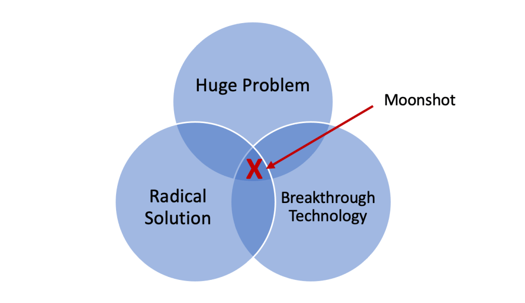 In his book Think Like a Rocket Scientist, Ozan Varol explains that moonshot starts with picking a big problem: something huge, long-existing, or on a global scale, such as nuclear fusion, quantum computing, preventing global warming or pandemics, etc. Next, it involves articulating a radical solution — a product or service or a concept that seems impossible, that sounds like it’s directly out of a sci-fi story. Finally, there needs to be some kind of concrete evidence that some breakthrough in science, technology, or engineering could actually make the solution possible in the next 5 – 10 years.